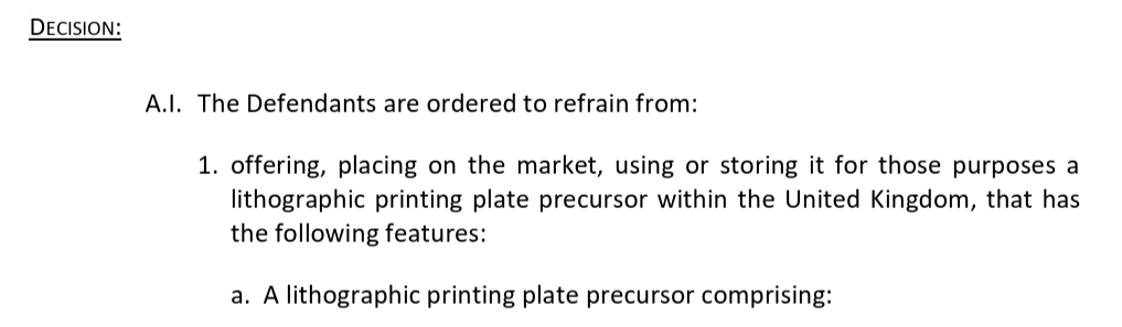 The winning patent-in-suit is EP3511174 (“Planographic printing plate original plate, method for manufacturing planographic printing plate, and planographic printing method”). The accused Kodak printing plate is named SONORA XTRA-3. The complaint sought damages for past infringement in some other countries where the relevant parts of the patent-in-suit have already expired, and both monetary and injunctive relief for two countries: Germany (that part was decided in early April as discussed above) and the UK.